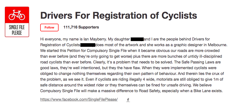 In the wake of the petition’s moment in the limelight, commentary was sparked on both sides of the debate. At CyclingTips, we weighed in too, calling for a nuanced, respectful approach from riders and drivers alike, and to be honest, thought that was where we’d leave it. The issue raged a little longer in headlines and talkback, and then something strange happened. When the media went looking for the people behind the petition, they came back empty-handed.