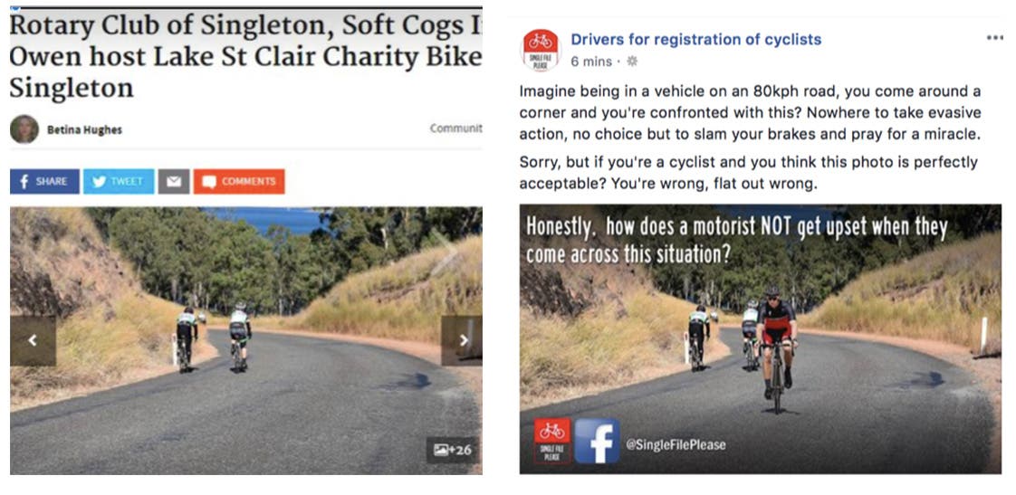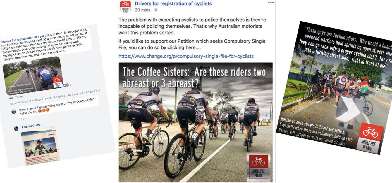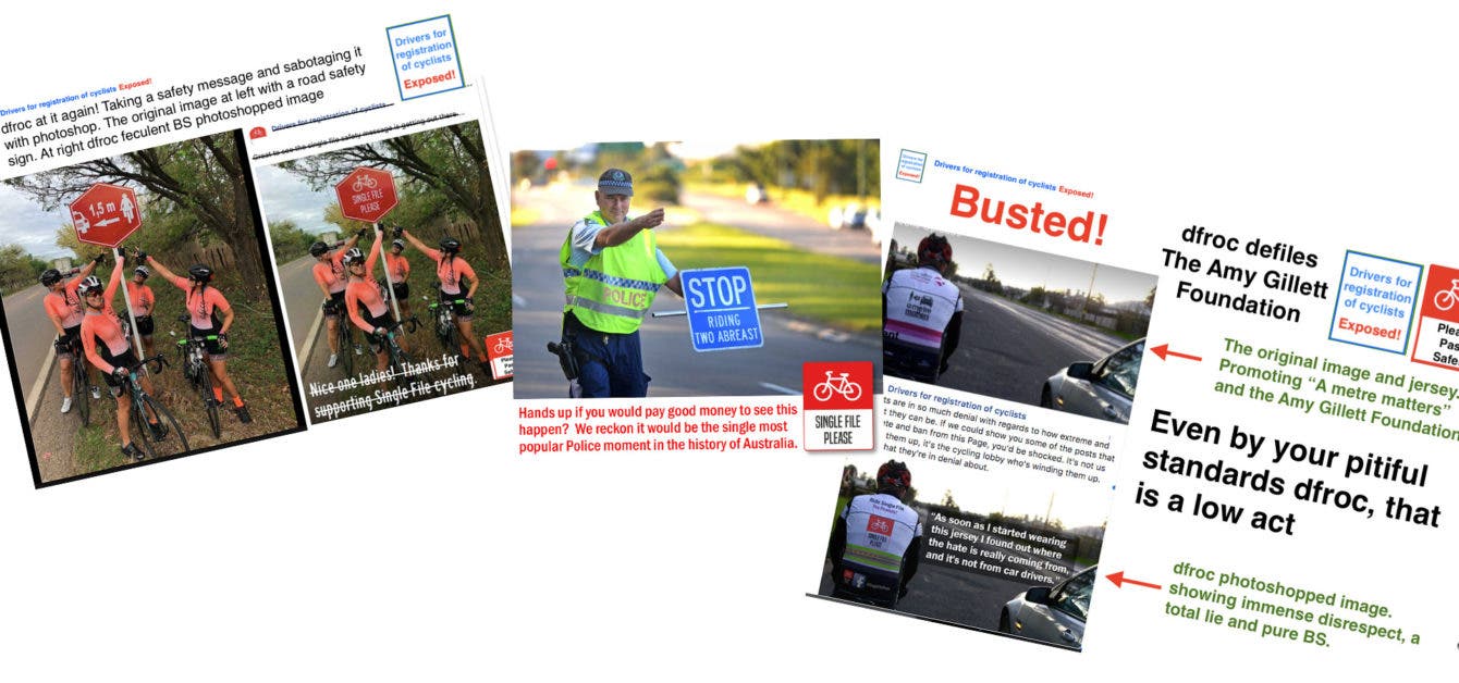 Most DFROC posts take a similar form. A photo of a cyclist or group of cyclists behaving badly, apparently flouting the road rules or otherwise acting irresponsibly. Often these images have been digitally manipulated, with riders photoshopped onto the wrong side of the road, or cars added in to make situations appear more dangerous than they are. A caption placed over the image will emphasise the page’s anti-cycling bent.