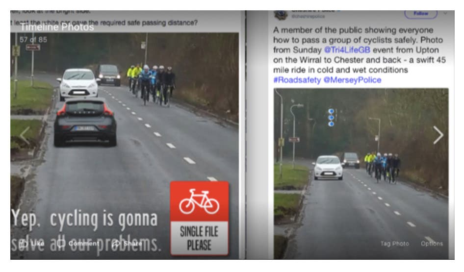 A composite screengrab showing a DFROC post with nearest car photoshopped in to make two-abreast cycling appear more dangerous (left) and the original image, from a UK safety campaign (right).