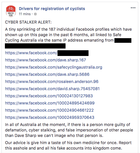 It’s hard to predict what will happen to DFROC from here. Some believe it will cross the line one too many times and that the page will shut down for good. There’s some suggestion that moment may have already happened when a post was published in late June showing the home address of Safe Cycling Australia founder Dave Sharp. That post, an escalation of the bitter feud between Mr X and Sharp, was swiftly taken down – but not before Sharp took the issue to Queensland Police and the Australian Federal Police.