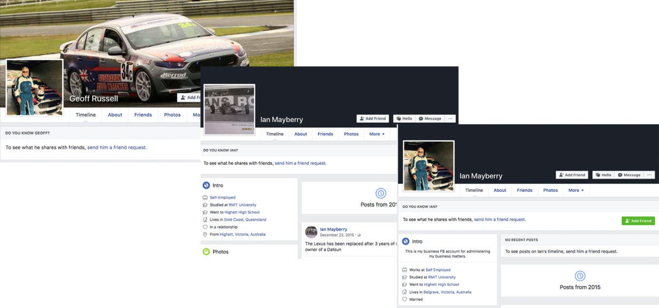 Left: Queensland race car driver Geoff Russell. Centre: the legitimate Ian Mayberry account. Right: the DFROC admin, ‘fake’ Ian Mayberry, with an account combining elements of both.