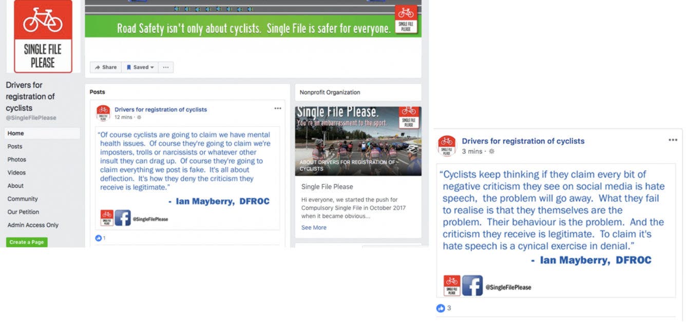 Meanwhile the Drivers for Registration of Cyclists Exposed Facebook page was set up in early 2018, specifically to expose DFROC’s lies.