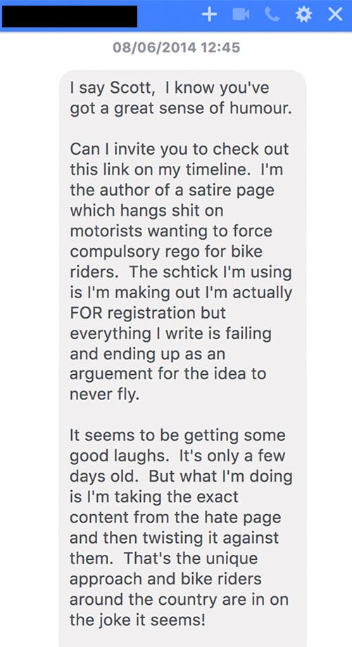 “I’m the author of a satire page which hangs shit on motorists wanting to force compulsory rego for bike riders,” Mr X said in a text message to McGrory. “The schtick I’m using is I’m making out I’m actually FOR registration but everything I write is failing and ending up as an arguement [sic] for the idea to never fly.”