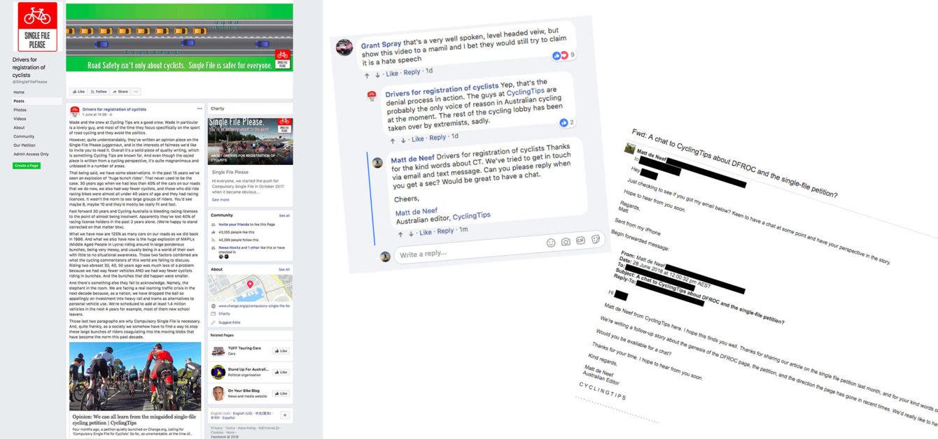 Left: DFROC’s commentary around CyclingTips’ opinion piece on the petition in early June. Centre: complimentary words for CyclingTips, followed by a request for comment. Minutes later, the page was hidden. Right: an unanswered email or two.