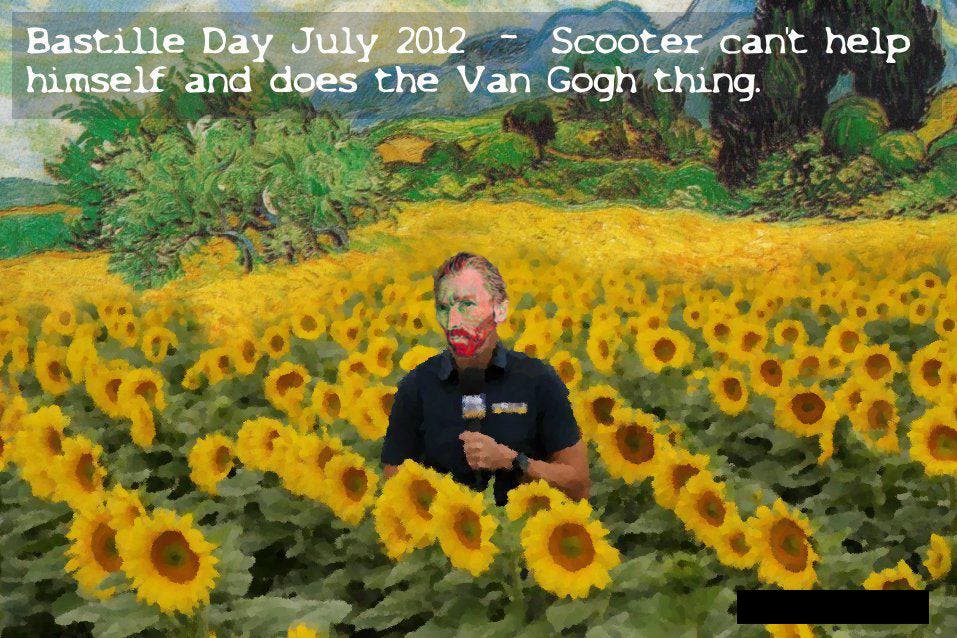 In the years that followed, the pair would correspond intermittently, two contemporaries and former rivals reconnected by social media. During the 2012 Tour, Mr X sent photoshopped images of McGrory doing coverage — images including a surreal Van Gogh-style recreation of McGrory in a field of sunflowers.
