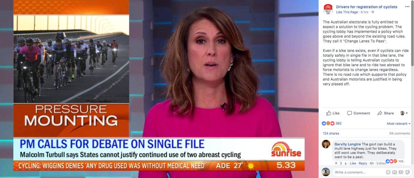 At time of writing, Drivers for Registration of Cyclists has over 44,000 Facebook followers, making it the largest anti-bicycle group in the English-speaking world (and possibly globally). DFROC post unambiguously anti-cycling messages – some focussed on the issue of single file cycling, some apparently showing riders misbehaving, some distorting facts or wistfully daydreaming of violence – which are enthusiastically shared and often venomously commented upon by the page’s followers.