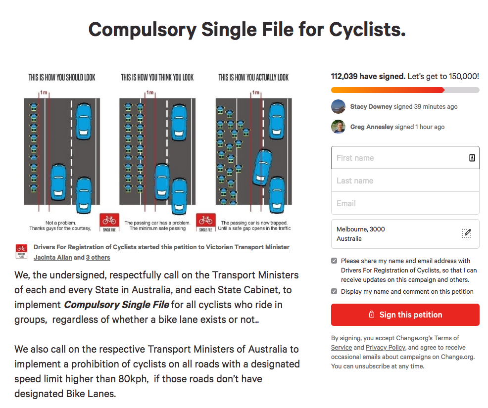 Perhaps the easiest way into the trenches of this digital battleground is if we drop you in with us a couple months ago, when a petition demanding compulsory single-file cycling was doing the rounds. Just as the petition came to our attention, mainstream media got a whiff of an opportunity to drum up one of their favourite constructs, the apparent ‘war on the roads’ between cyclists and drivers. Cue the op-eds, the shock jocks, the current affairs show segments …