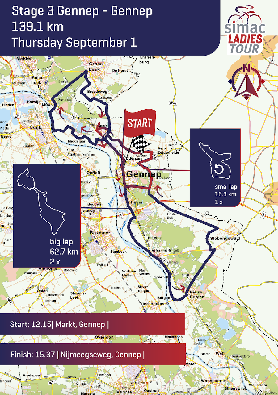 Another day of circuit racing is on tap for stage 3, except this time the course is broken into two different loops. The peloton will race one 62.7 km big loop twice and finish in Gennep on a 16.3 km circuit.