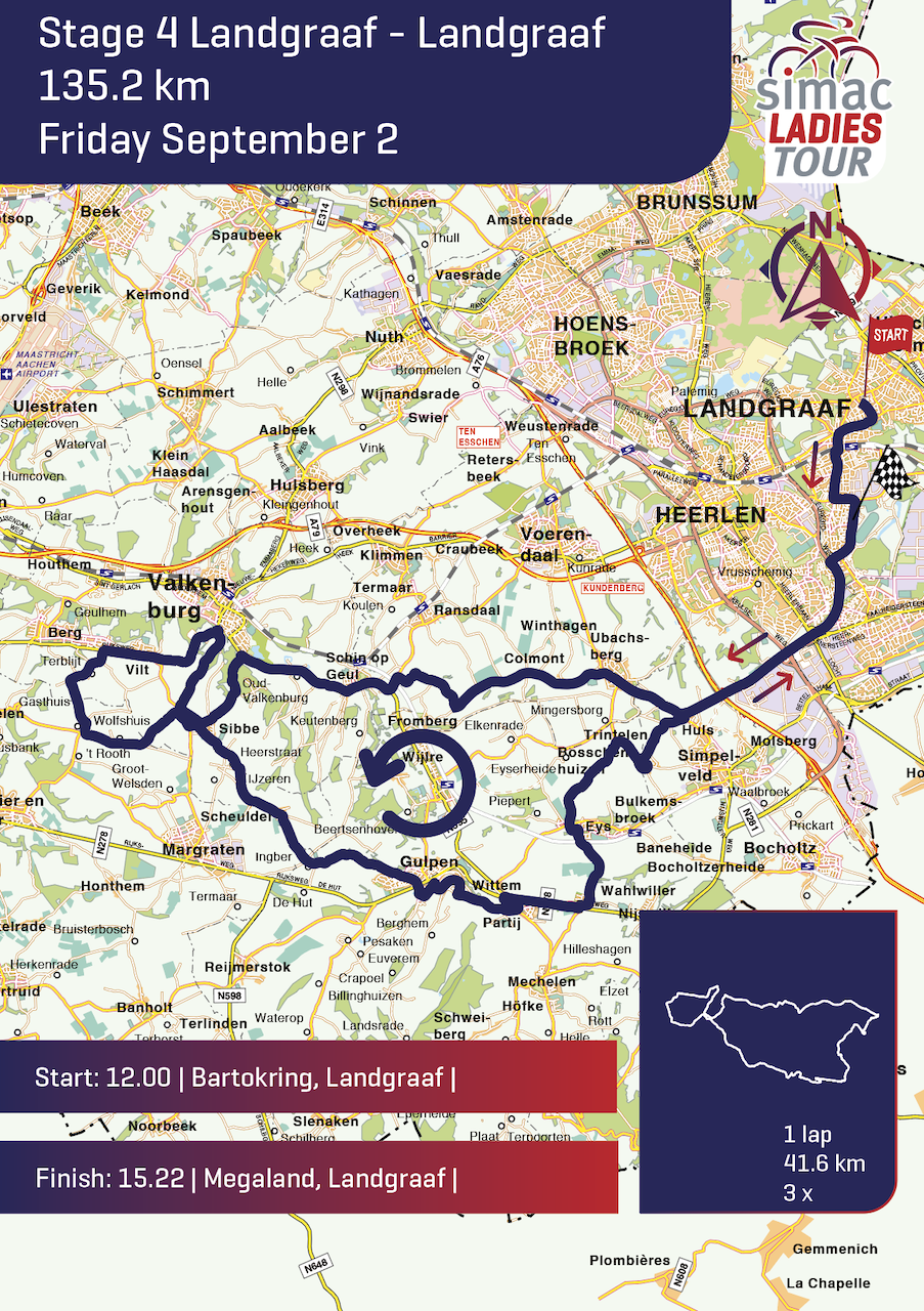 The fourth stage finally sees some elevation gain. After starting in Landraaf the peloton will race three laps of a 41.6 km circuit that includes five climbs. The first is the 1.2 km long Sibbergrubbe, followed by the iconic Cauberg. With a 9.2% average gradient the Cauberg will be a significant part of the stage.