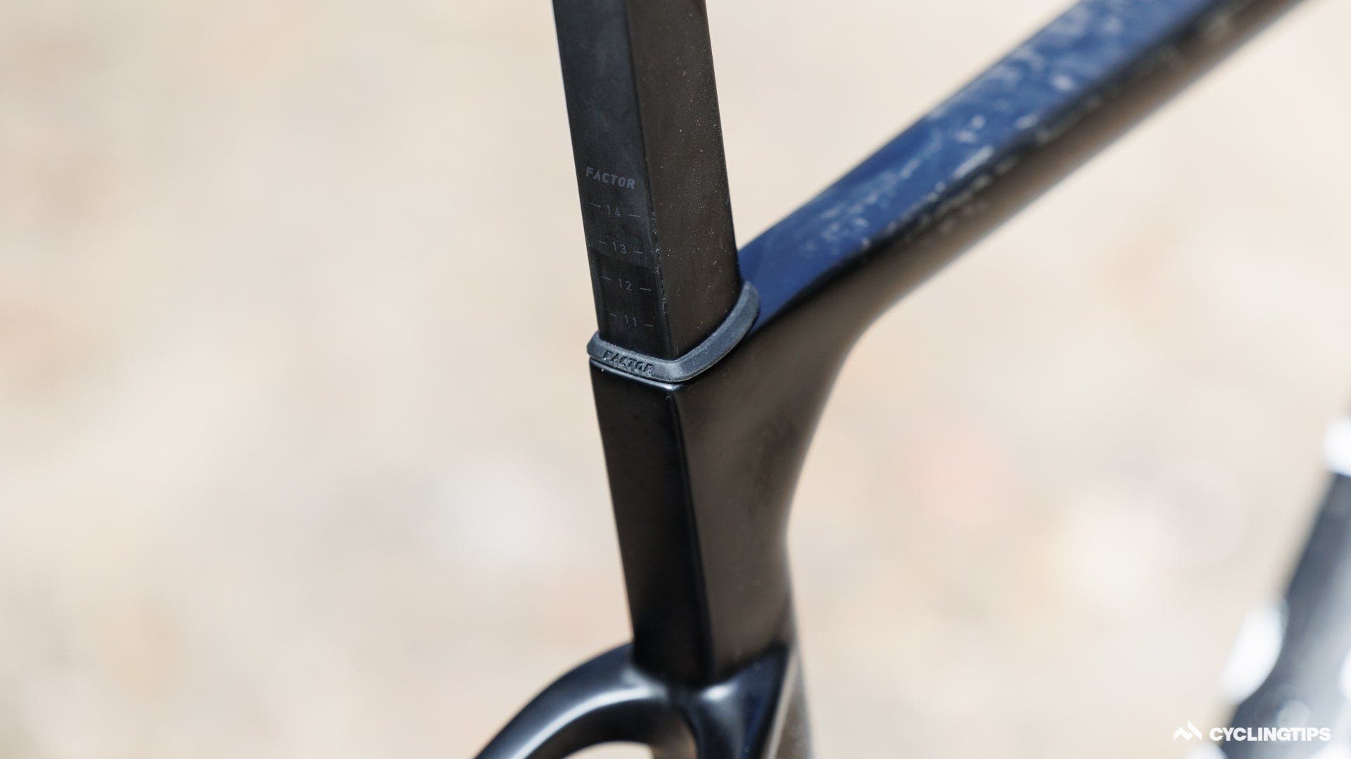 “As soon as you put a (frame) tube behind a 40 mm tyre there’s really nothing you can do about the airflow, it’s just going to be a mess,” said Shrive about why Factor has instead focussed on optimising tube shapes that sit in uninterrupted places, specifically the handlebar, head tube, outsides of the fork, and the seatpost. These relatively deep tube shapes feature truncated airfoil profiles tailored to make slow speeds faster (well, more efficient).