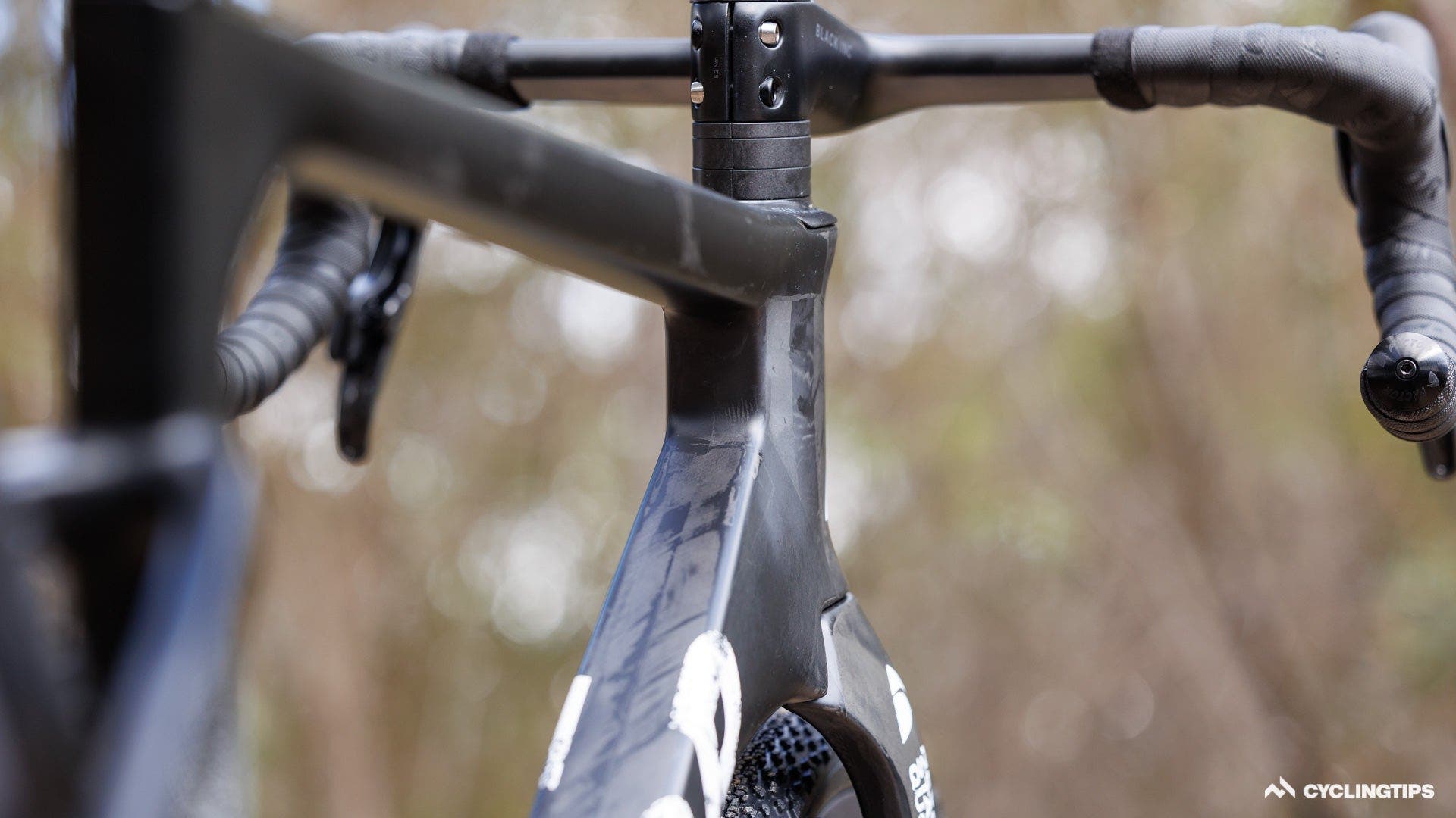 I was looking down at what seemed like a fully aero road race bike, which steered like a race bike, and which had stiff ride quality like an aero race bike, and yet, the front wheel was noticeably further out in front of me. I found myself having to correct for this, getting my weight more over the front of the bike for sharp corners. Slow climbs would reveal a feeling akin to a head tube that’s too slack (even though it isn’t) – a sense of wheel flop if you will.