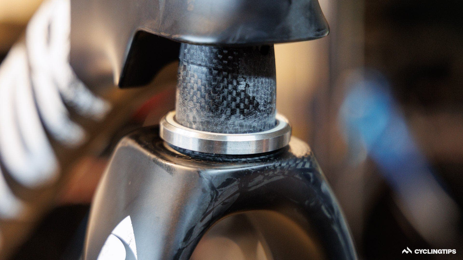 From my point of view, I agree that those SLT bearings will likely last the life of the bike. Likewise, that uniquely long compression ring gives me faith that steerer damage is unlikely (through cutting or material depression). However, some level of maintenance, namely cleaning and greasing the outside interfaces of the bearings, will be needed eventually. Thankfully, this won’t require cutting brake hoses so long as the bike is set up with headset spacers and/or excess hose tucked within.
