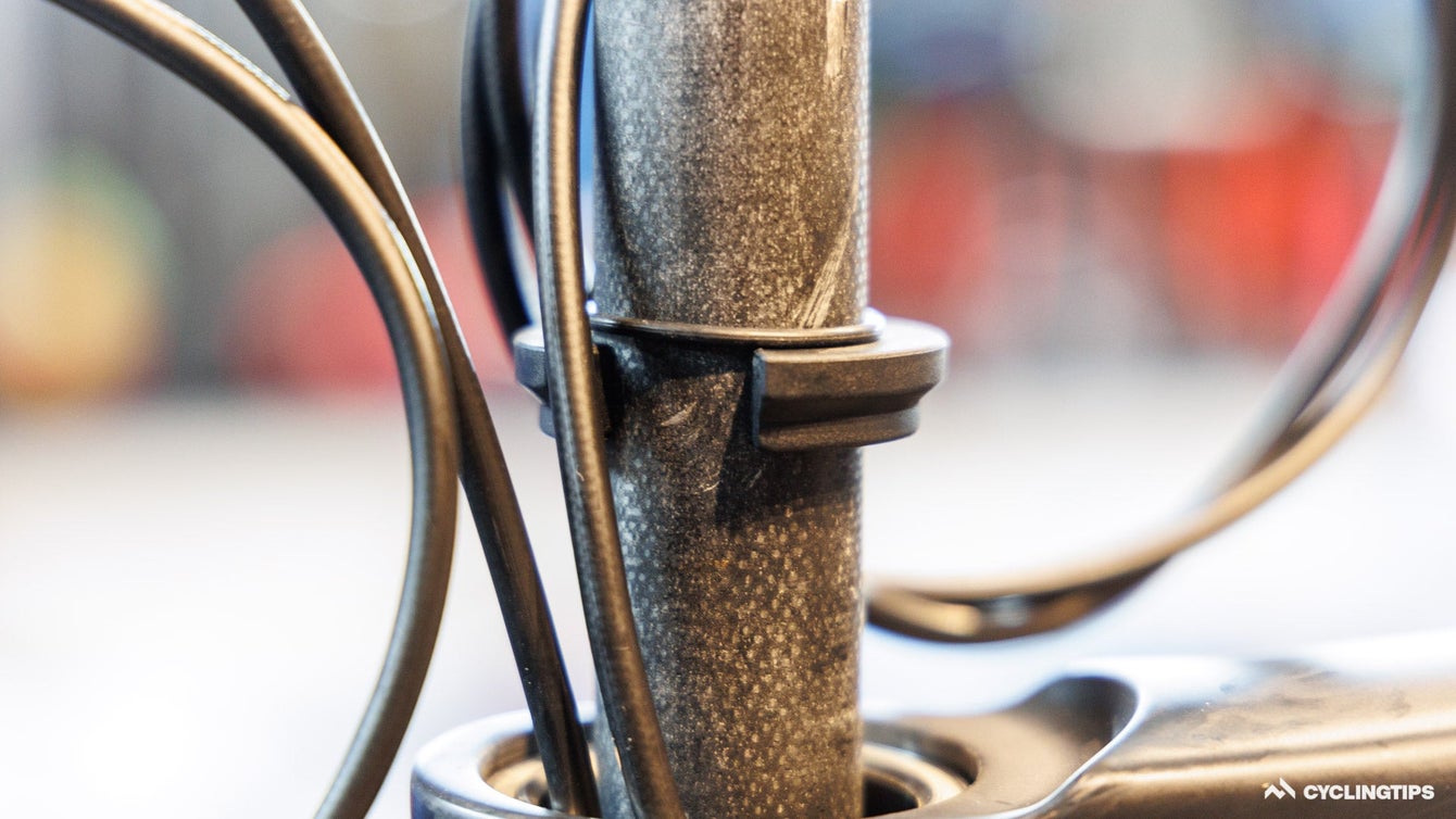 This gravel steed can only be used with hydraulic disc brakes and electronic gearing. The way the brake hoses are routed through the gap in the headset compression ring leaves no room for mechanical cables; frankly, such cables don’t belong anywhere near a bike with wholly concealed cabling like this.