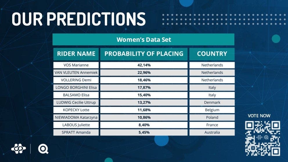 A caveat – the Machines were crunching their numbers before Annemiek van Vleuten crashed out of the mixed team time trial, putting her start at risk. Also, apparently The Machines don’t rate Grace Brown as a top 10 favourite. But all that aside? Those are certainly some credible names.