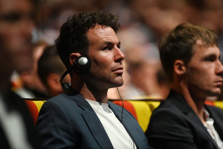Still, could be worse. After all, he’s carrying a Vittel, not a molten cup of Senseo.Mark Cavendish’s contract and Tour attendance are still up in the air for next year, but he was in Paris nonetheless.