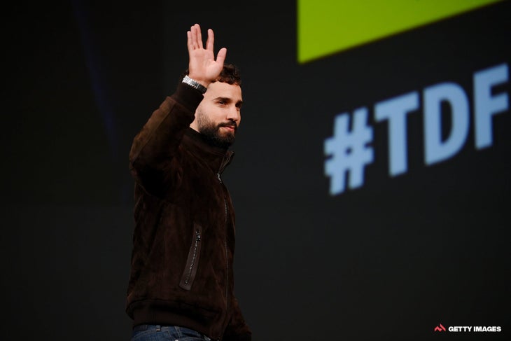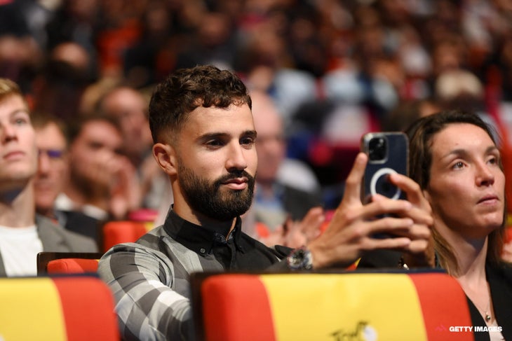 Greg Van Avermaet (AG2R-Citroën) is a veteran of the Tour de France route presentation, often wearing grey suits with a t-shirt undermeath. The definitive Van Avermaet outfit, for mine, was 2016’s Big Brown Scarf; this doesn’t reach those heights, but is suave enough. His shoes are certainly white.Nacer Bouhanni (Arkea-Samsic) has had a long journey back to health after a horrible crash at the Tour of Turkey, and will be hoping to break his winless streak at his home Grand Tour. He’s one of the peloton’s more controversial figures due to at least five aggressive incidents throughout his career, but has recently become a father and has a nice brown suede jacket so we shall see whether either of those things soften his pugilistic demeanour.Felt cute, might delete later.David Gaudu, the peloton’s foremost Twitch streamer, looks like the peloton’s foremost Twitch streamer.Pierre Latour (Team Total Energies) almost disappears into the background with this dark ensemble, giving a pursed-lips wave to the auditorium.In the more sharply contrasted environs of this picture, you can see he’s got a nice floral print, a waistcoat and a pensive demeanour. I am into all three.Geoffrey Bouchard (AG2R-Citroën) has a blazer, a confident stare, and just so many things in his pockets.The champion of carrying stuff into the presentation, however, is Arkea-Samsic’s Maxime Bouet. Not content with looking like he’s just raided Tom Cruise’s Mission: Impossible wardrobe, Bouet has a banger of a shirt jacket, some big black boots, black-on-black everything else, and a backpack with metal studs on it.