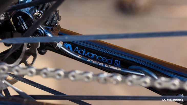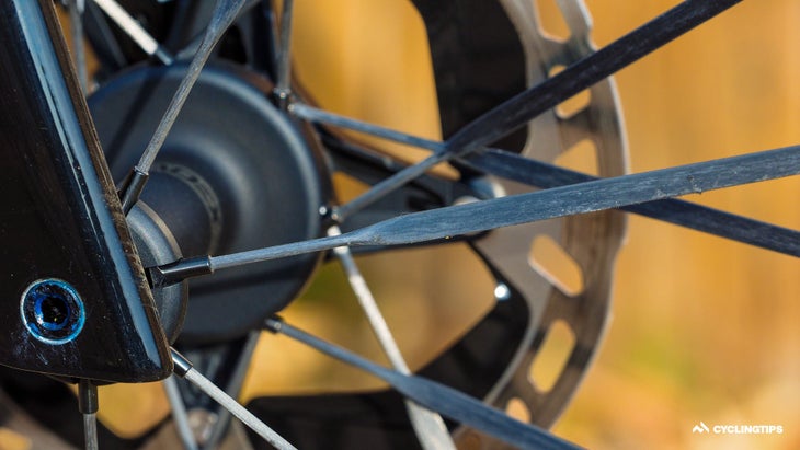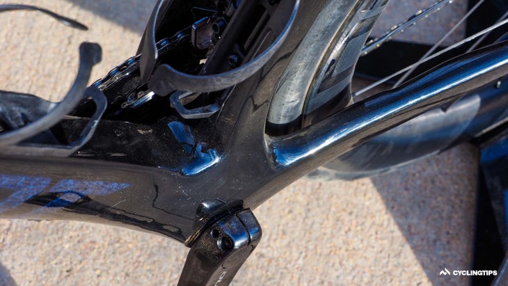 As before, the control line routing is fully concealed so as to maximize the bike’s aero profile. It’s a tidier setup this time around with the control lines running along the underside of the stem instead of up top before taking a downward turn into the upper headset cover. That arrangement does away with the goofy bolt-on stem cover, and also makes for shorter paths with smoother bends. The stem can be swapped without having to futz with any hoses or wires, and small changes in bar height are easy too (assuming you have enough slack in the lines).