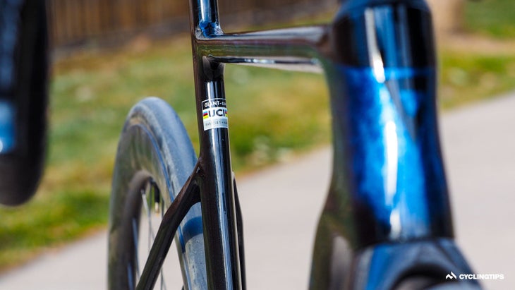 To go along with the weight savings, Giant is also claiming an 8-10% boost in frame stiffness (and we’re talking in absolute terms, not just stiffness-to-weight) as well as a two-fold improvement in rear-end compliance, at least for the flagship seatmast-equipped Advanced SL version.