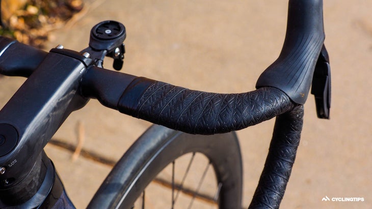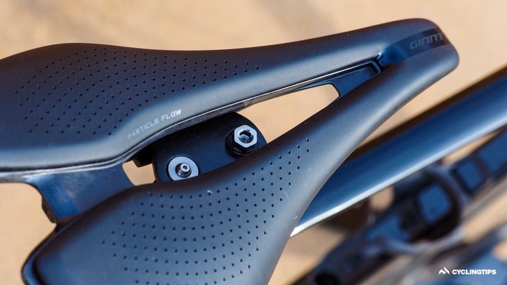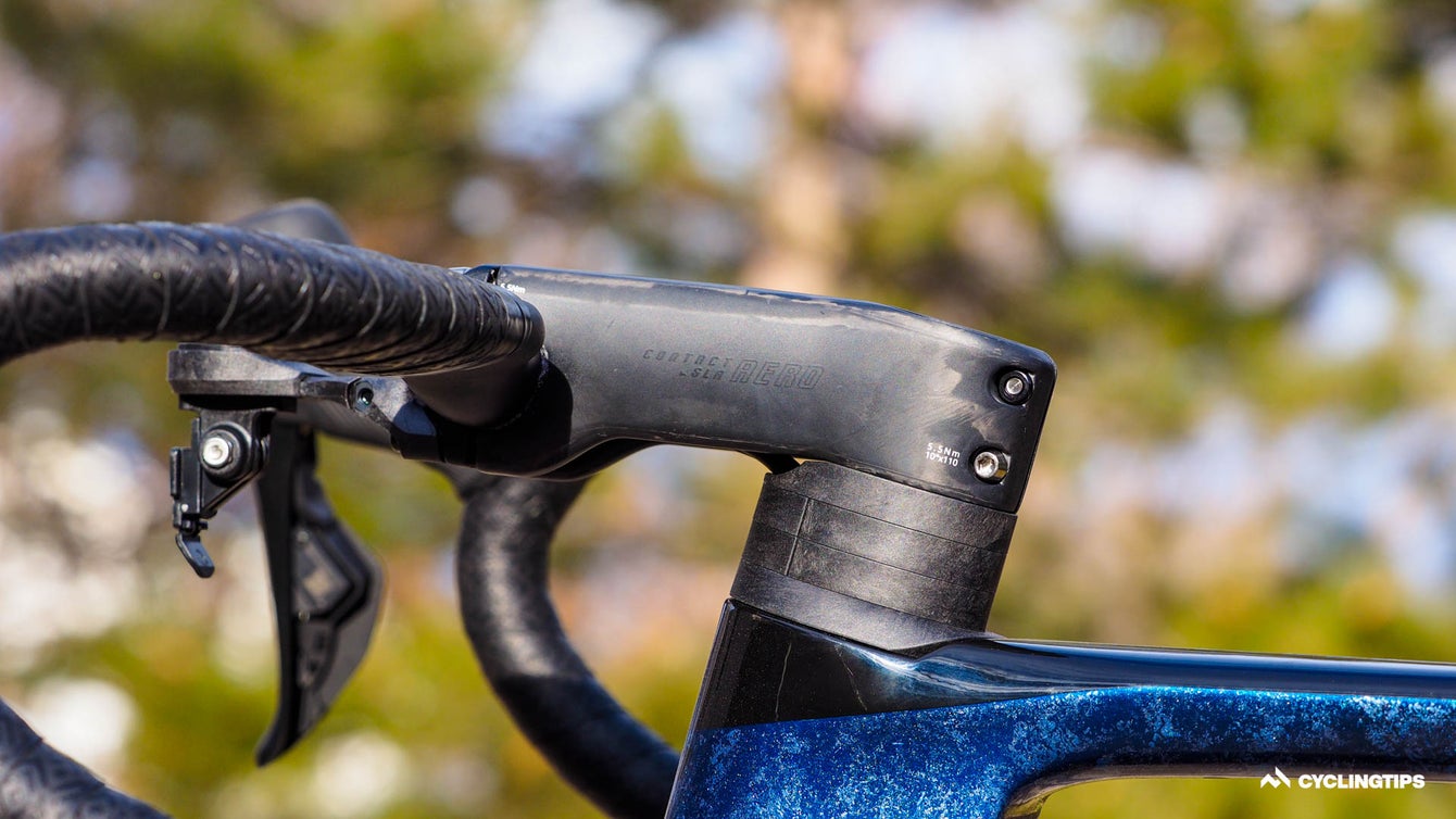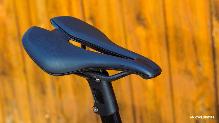 I have zero complaints with the rest of the house-brand finishing kit, however. The carbon-railed Cadex Fleet SLR saddle is one of the most comfortable snub-nosed models I’ve tried, and at just under 140 g, it’s very light. And up front, the stock Giant Contact SLR Aero carbon bar sports a pleasantly neutral bend with appropriate drop-and-reach figures, and aero-shaped tops that actually aren’t terrible to hold on to. And again, even if I didn’t like the bend, kudos to Giant for not forcing you into a proprietary bar (I’m looking at you, BMC, and Canyon, and Cervelo, and Scott, and…).