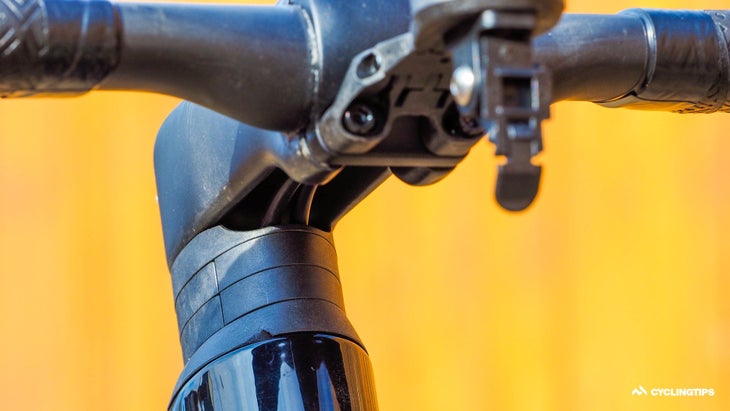 Regular readers and listeners of CyclingTips won’t be surprised at all to hear that I’m not a fan of fully internal cable routing (once a mechanic, always a mechanic…). That said, thankfully none of the lines run through the inside of the stem. I could do without the internal routing through the bar (not to mention a normal amount of bar tape instead of leaving the tops bare and slippery), but at least Giant hasn’t limited your options for such a critical contact point.
