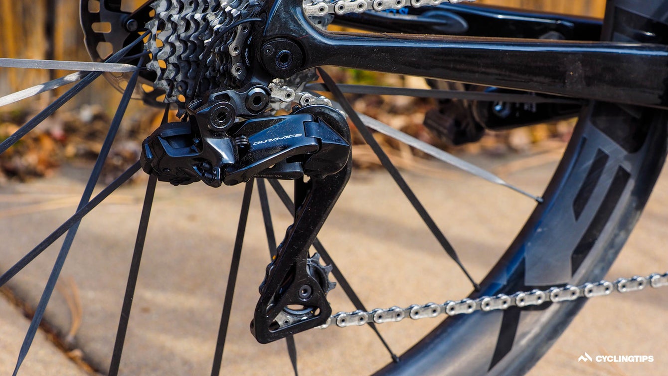Shifts are both lightning-fast and phenomenally consistent out back, and front shift performance continues to be the absolute best in the business, hands down. Lever ergonomics are superb, too, the upgraded hydraulic disc brakes are still plenty powerful and now (very marginally) quieter than before, and although the all-black finish won’t please everyone, I find it more appealing than some of the two-tone setups Shimano has used in the past.