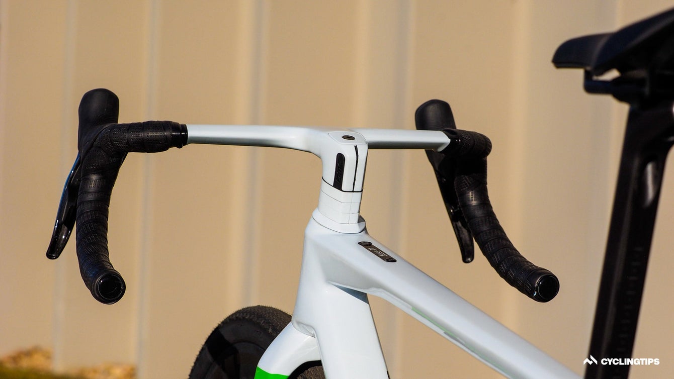 Now, one more thing about this integrated bar/stem: I hate that the tops are untaped. I understand why bike brands do this on high-end, full-aero road bikes: marginal gains and all, and most people riding those bikes probably aren’t using the tops much, anyway. But the Kaius isn’t an aero road bike. Any time I used the tops, I was struck by how slippery the painted surface was, and how challenging it was to get a secure purchase – with or without gloves.