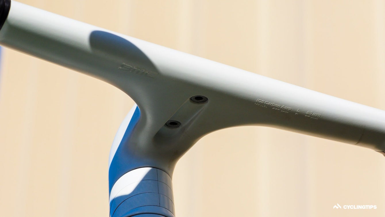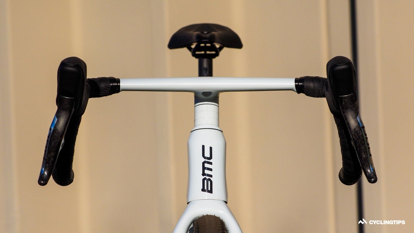 I know I keep banging on this drum, but I find the fully internal routing to be particularly grating here. BMC has also demonstrated that it can do concealed routing without running the control lines inside the bar and stem – a minor improvement, but an improvement nonetheless – so I struggle to understand why that wasn’t done here, particularly given the polarizing 36 cm bar width. It just isn’t going to work for everyone, and it’s going to be a massive hassle to swap it out. Prior experience with other similar one-piece BMC cockpits suggests those brake hoses won’t come out wholly intact, either.