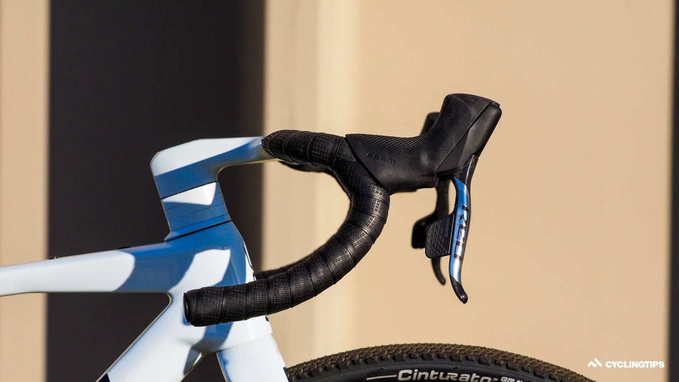 I’ve written at length about the virtues of SRAM’s Red AXS XPLR wireless electronic groupset, and the same accolades apply here. The 10-44T 12-speed cassette offers plenty of range for this sort of gravel riding, and when combined with the stock 42T chainring, you’ve got all the climbing gear that most reasonably fit riders will need (and if that isn’t enough, chainring swaps are relatively cheap and easy). Shifter ergonomics are also very good – eTap is still my preferred style of electronic shifting – and the brakes continue to impress with their excellent power and control, even if the lever action could still stand to be a bit lighter and snappier.