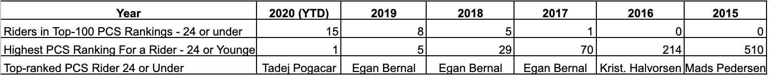 So we looked at the number of young riders who were able to generate at least 100 PCS points during a season. As shown in Table 2, this figure has also been exploding. Once again, prior to 2015, it was essentially unheard of for a young rider – 24 or younger – to generate anything in the region of 100 PCS points. In 2015, just one rider was able to accomplish that – Mads Pedersen, who later became the 2019 world champion. By 2016, seven more young riders joined him in achieving at least 100 PCS points. This metric then exploded to more than one hundred riders in 2019. And the trend has continued during this COVID-shortened season (but again note that 2020 figures are not directly comparable due to the shortened calendar).