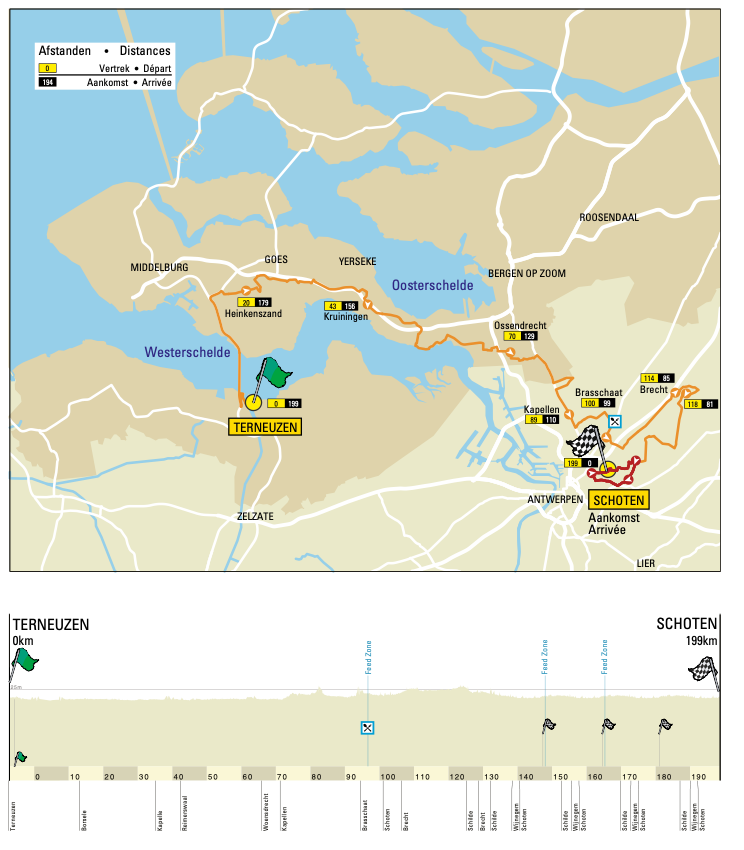 The men’s 199km second-division race rumbles out of the Dutch port city of Terneuzen and tracks a pancake-profile-parcours exposed to the North Sea.