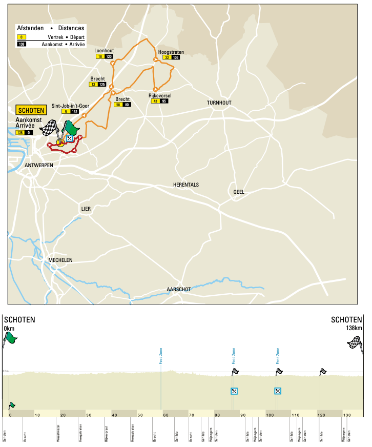 Starting and finishing in Schoten, one large wind-swept loop makes way for the finishing circuits in Schoten. Like with the men’s race, crosswinds could shape the situation before those still at the front make a mass gallop for classics kudos.