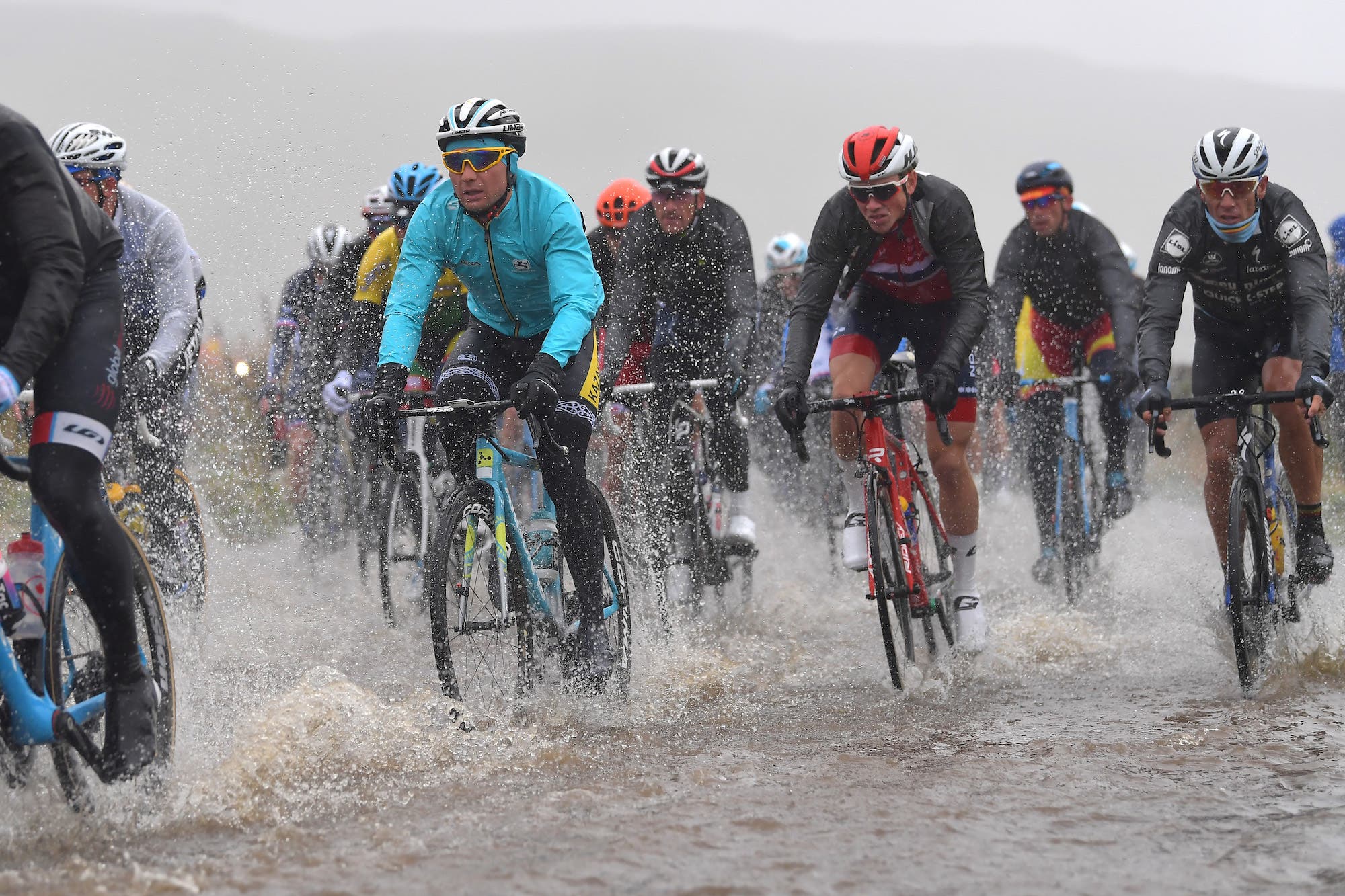 Rain fell heavily the preceding night and through the first 150km of the race. The route was shortened by 25km to avoid deep sections of standing water, but the peloton still had to negotiate deep puddles in places, and TV coverage was impacted as race helicopters couldn’t fly in the high winds.