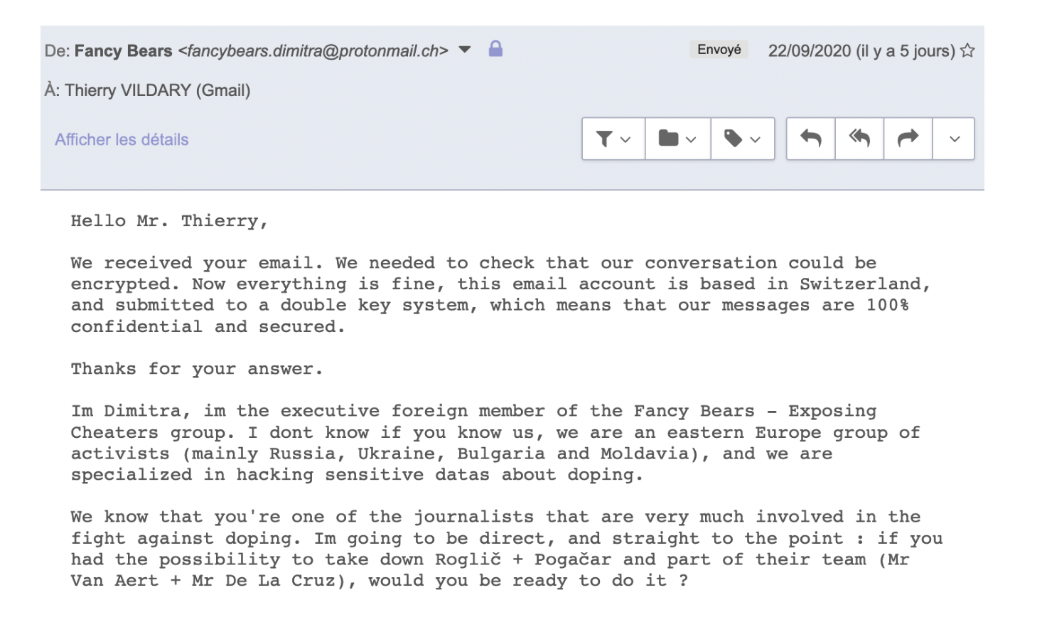 Per that same source, Dimitria wrote to Vayer that he had been trailing prominent teams clandestinely throughout the 2020 Tour de France and secured access to encrypted team chats on Telegram. The alleged claims against cycling mostly targeted UAE Team Emirates and Jumbo Visma. While VeloNews is unable to verify whether Fancy Bears were actually behind these emails (Russian hacking cartels are notoriously difficult to reach for comment), Vayer told VeloNews via WhatsApp that he still believes the leaks were real.