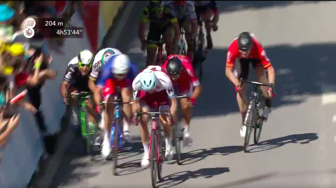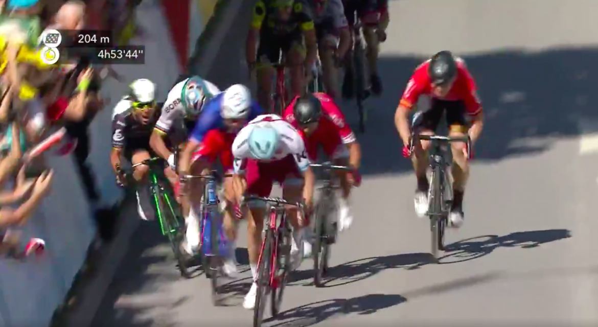 It’s clear from both angles that Sagan deviated from his line, at first in response to the riders in front of him. The entire group moved consistently to the right as the sprint progressed. But then Sagan made another shift to the right as Cavendish tried to sneak past. There are rules against changing lines in a sprint, but generally only egregious infractions are enforced.