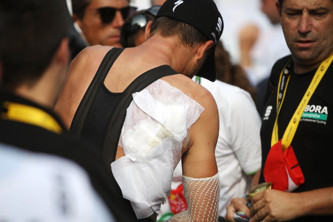 Sagan’s day of suffering stems from his scary crash on Wednesday’s stage 17 from Bagnères-de-Luchon to the Col du Portet. Sagan crashed hard on the descent of the Col de Val Louron-Azet, suffering cuts and road rash to his right side. Since then he has raced with thick white bandages on his right arms and legs to protect his various cuts and bruises.