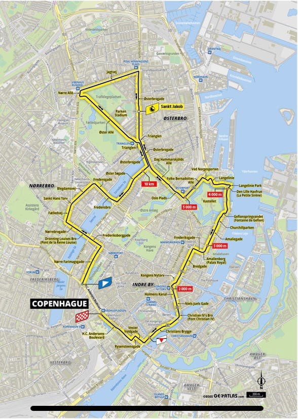 The time trial starts with a long straight before sweeping back and forth across one of Denmark’s major canals. The time check at Sankt Jakob will give the stage favorites their first fixed reference.