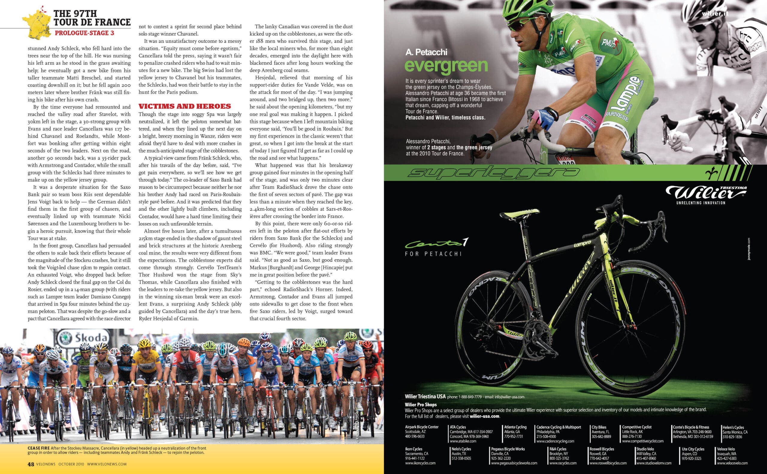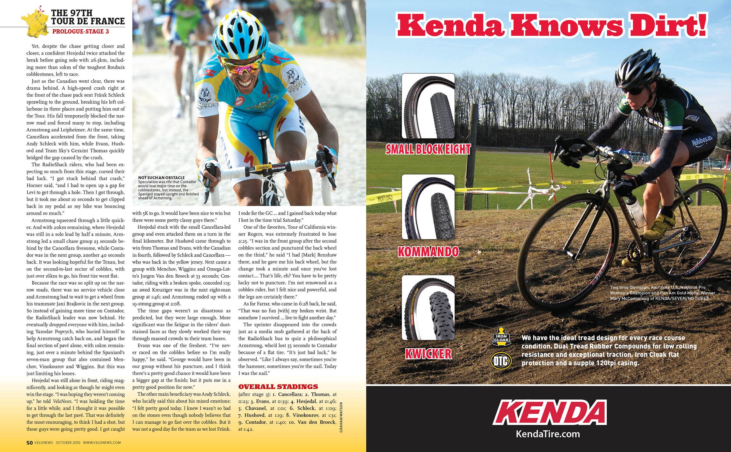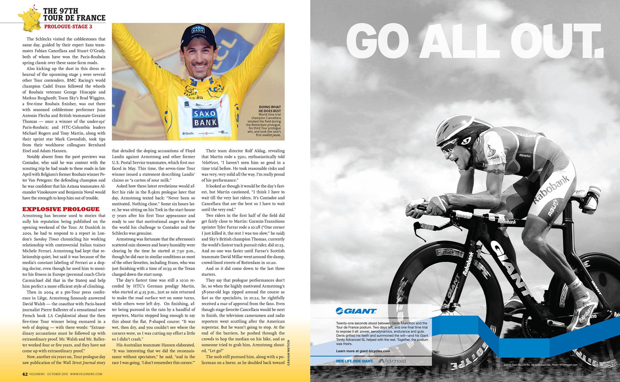 Hesjedal stuck with the small Cancellara-led group and even attacked them on a turn in the final kilometer. But Hushovd came through to win from Thomas and Evans, with the Canadian in fourth, followed by Schleck and Cancellara — who was back in the yellow jersey. Next came a group with Menchov, Wiggins and Omega-Lotto’s Jurgen Van den Broeck at 53 seconds; Contador, riding with a broken spoke, conceded 1:13; an awed Kreuziger was in the next eight-man group at 1:46; and Armstrong ended up with a 19-strong group at 2:08.