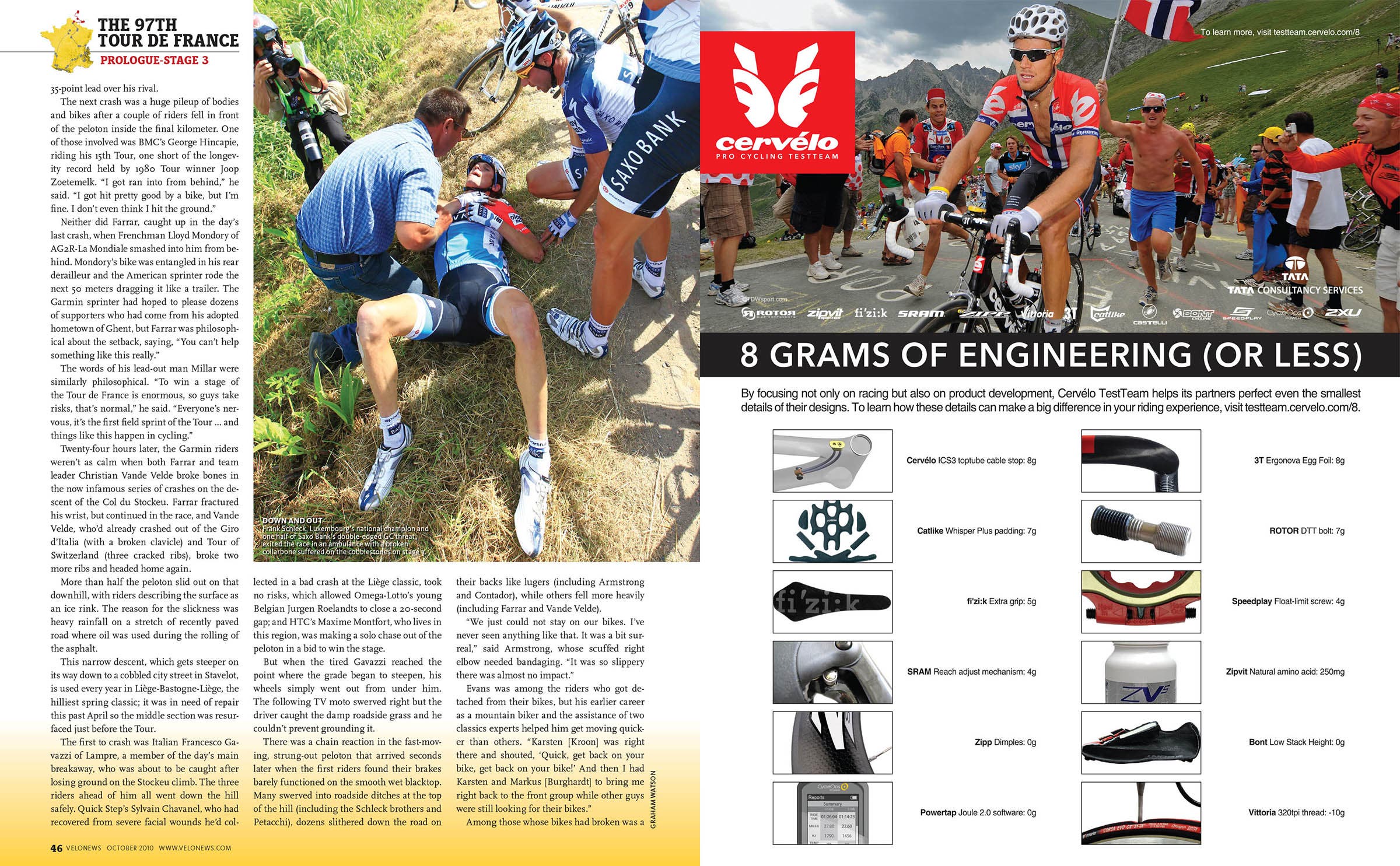 As for Farrar, who came in 6:28 back, he said, “That was no fun [with] my broken wrist. But somehow I survived … live to fight another day.” The sprinter disappeared into the crowds just as a media mob gathered at the back of the RadioShack bus to quiz a philosophical Armstrong, who’d lost 55 seconds to Contador because of a flat tire. “It’s just bad luck,” he observed. “Like I always say, sometimes you’re the hammer, sometimes you’re the nail. Today I was the nail.”