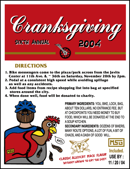 Cranskgiving began its life as an alleycat: a race held by bike messengers and urban cyclists, usually from point A to point B, or between multiple checkpoints. In 1999, New York City messenger Antonio “Tone” Rodrigues thought up a different kind of alleycat, one that would help the less fortunate during the Thanksgiving holiday. And though there would be winners—given tuna cans rebadged with a Cranksgiving logo resembling a Campbell’s Soup can to mark their success—this alleycat would be primarily for charity. On November 20, 1999, the first Cranksgiving took place.