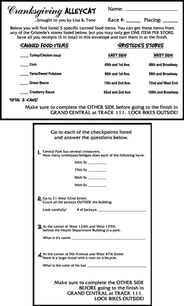 From its inception as a bike messenger organized charity race, Cranksgiving has remained a simple, mostly decentralized event, with no one right way to organize it. To start a Cranksgiving in a new city, all a potential organizer needs to do is find a charity, see what food items it needs, find stores that have those items, and create a manifest for racers to find those items.