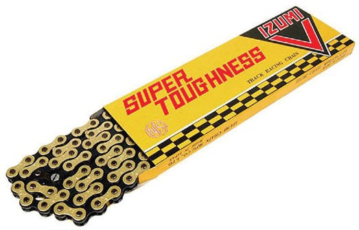 IZUMI V CHAIN. With more than a century of experience making chains for bicycles, as well as for everything from cars to industrial machinery, Japanese manufacturer Izumi knows how to make a quality chain. The Izumi V is one of the few chains approved for the monster power outputs of elite keirin racers in Japan, so ride this chain knowing it will be able to handle whatever efforts you throw at it. With this strength comes durability too; Izumi claims the V chain will last more than three times as long as a standard chain. A unique nut-and-bolt-style connecting pin provides additional security to this black-and-gold chain that is certain to add some flash to any track set-up. $80; izumichain.co.jp