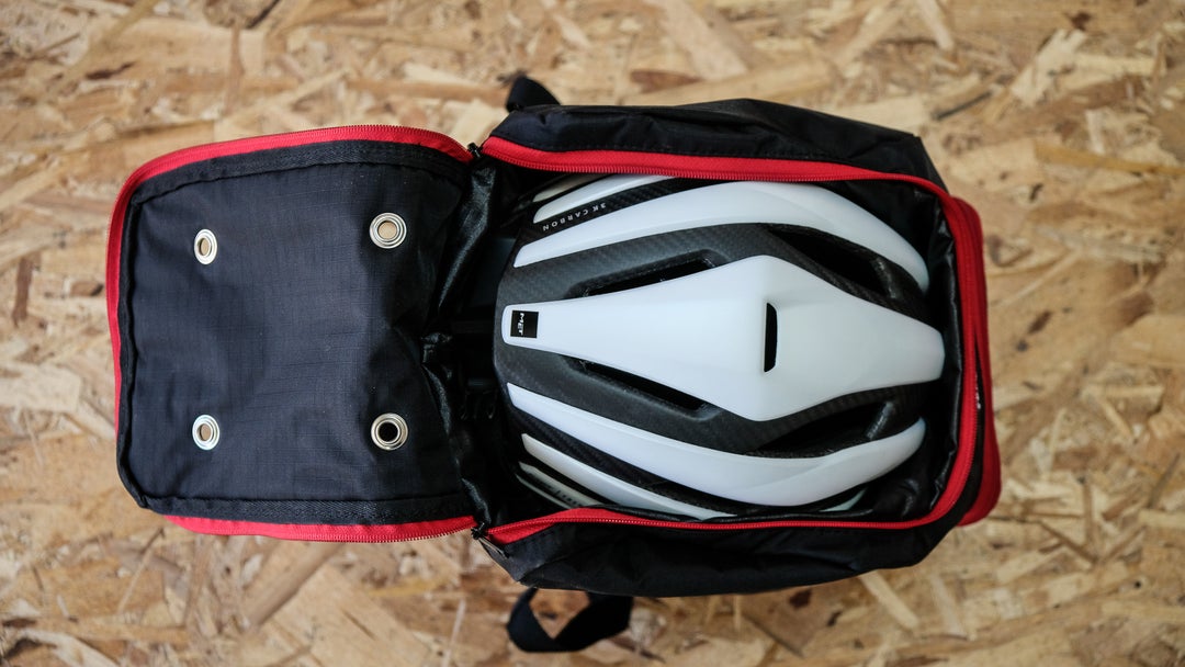 There’s a dedicated helmet pocket that’s vented to let your lid dry post-ride. Same goes for your shoes, which go in their own compartment on the bottom of the bag. The main compartment is where you’ll stuff your kit. Within that main compartment, you’ll find two zippered pockets — one of which is mesh — for your phone and keys.