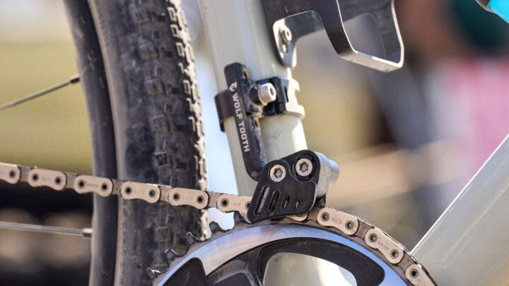 Grant has a Wolf Tooth GnarWolf chain catcher on her Quincy, a highly secure option to combat chain drops on 1x drivetrains.