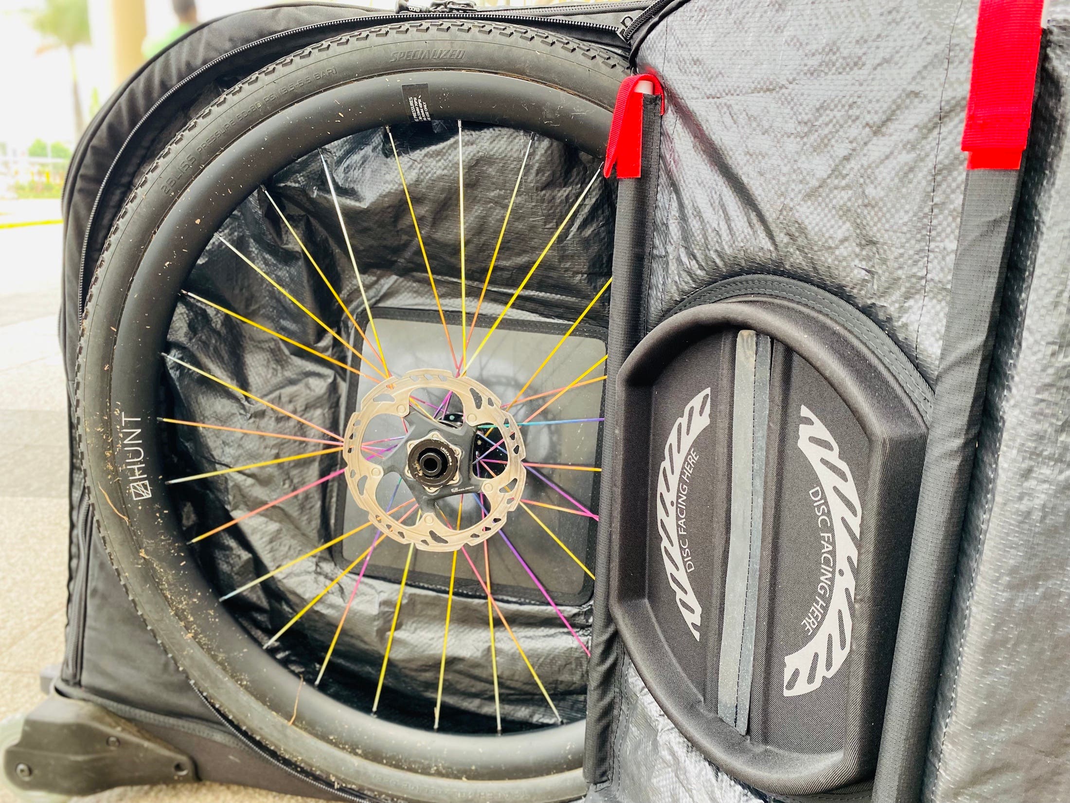 EVOC Bike Travel Bag Pro: This bag requires a bit of initial assembly (like inserting the rods that form the skeleton of the case), but packing it is very straightforward. Mount your bike to a removable stand using the provided through-axle adapters, secure the stand and the frame to the inside of the bike with webbing straps, and chuck the wheels go in the padded external pockets (no need to remove rotors). My favorite touch is the removable clip-on wheel that goes on the front of the bag, making steering it that much easier.