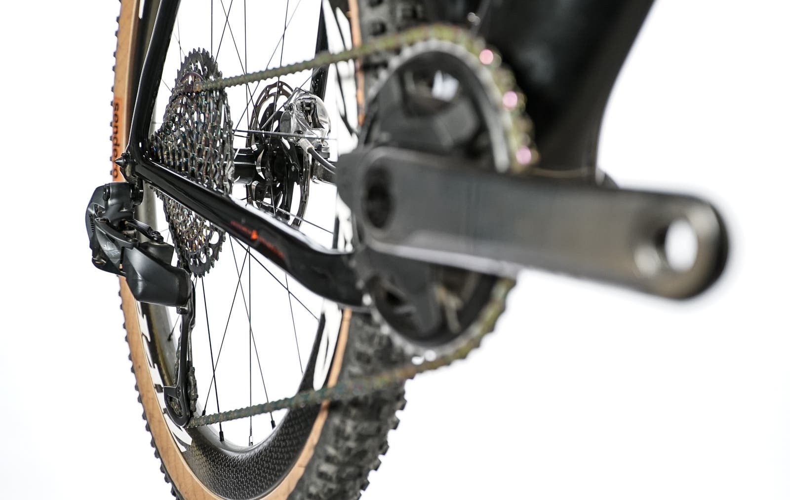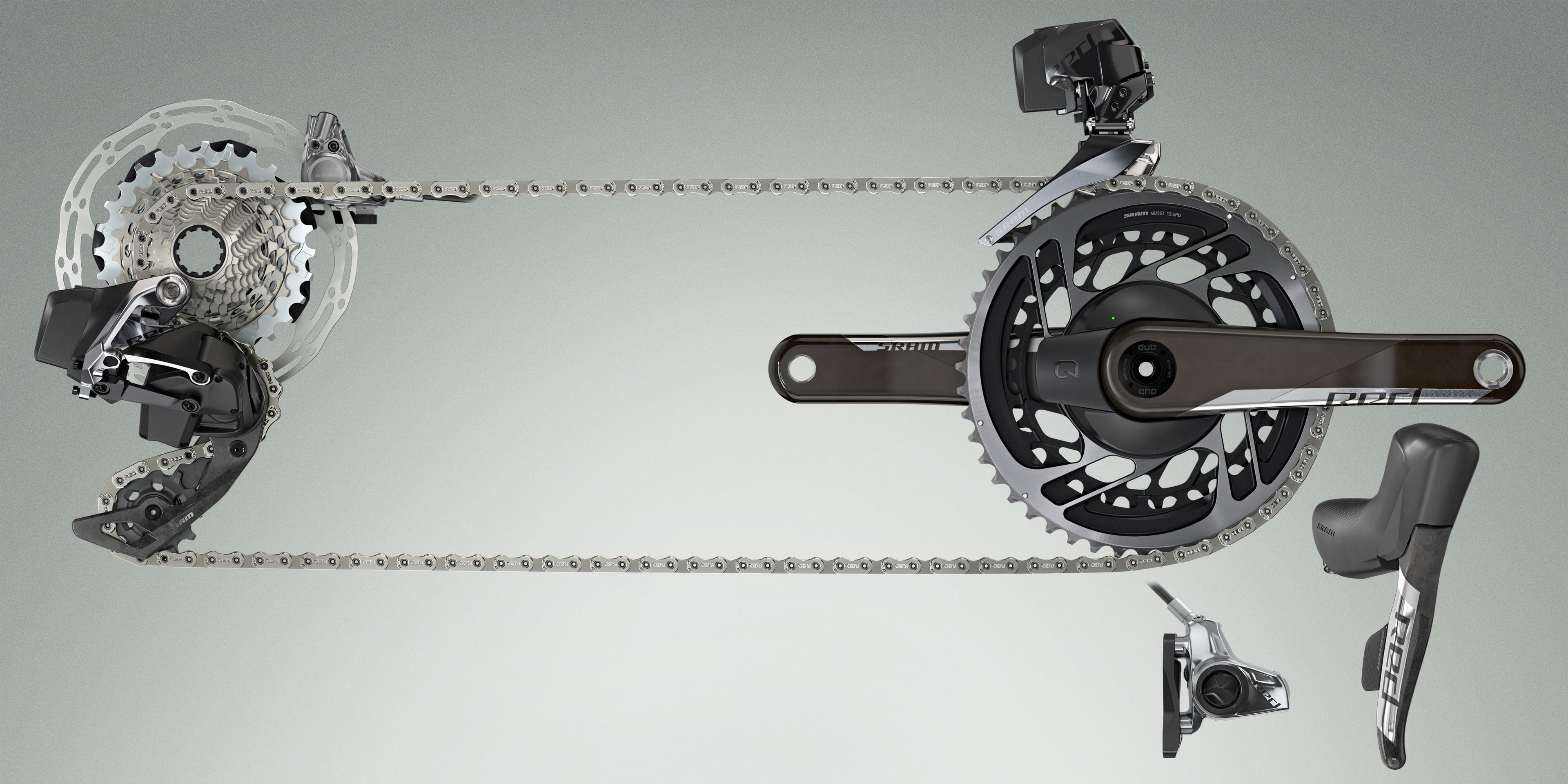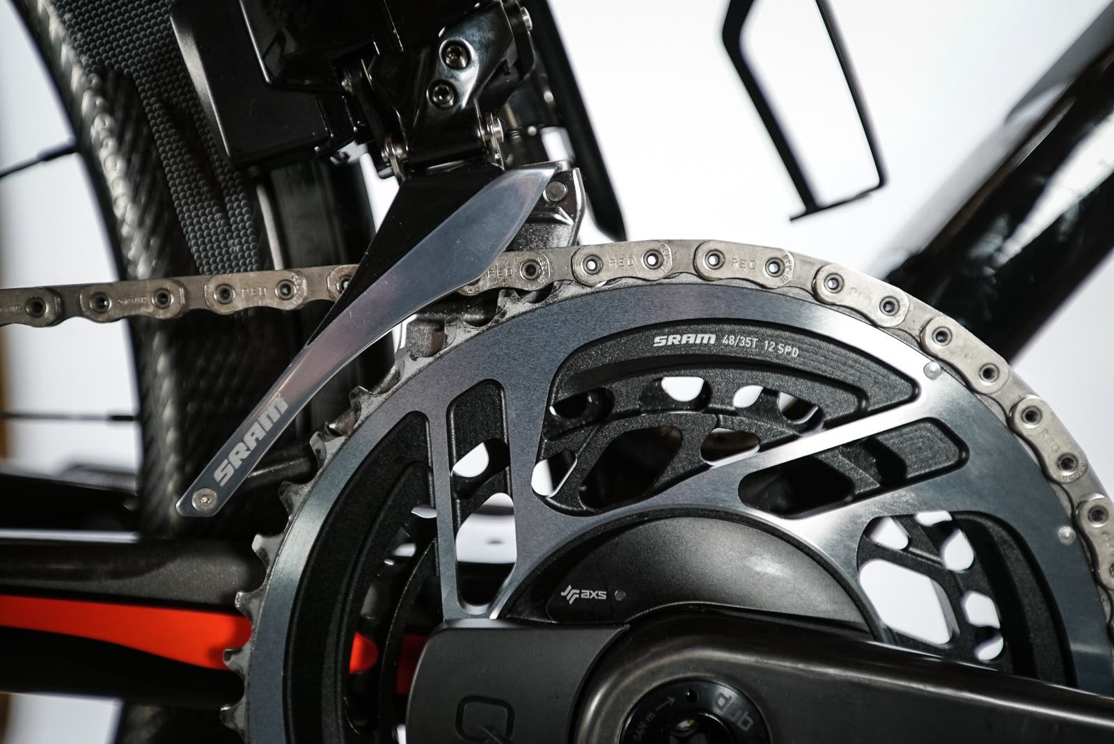 • SRAM Red eTap AXS wirelessly shifts a 12 speed cassette in a 2x or 1x configuration.