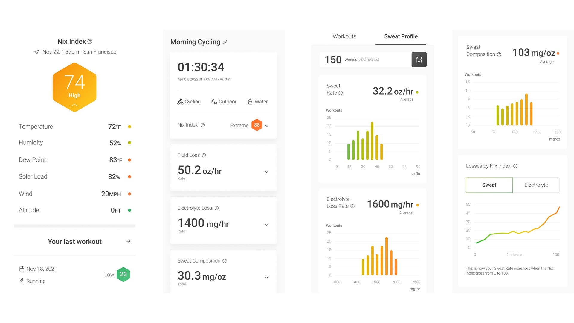 The app provides live data during workouts, historical data for post-workout analysis and trend spotting, and predictive data for calculating hydration requirements for a given event based on weather forecasts. During workouts, the app also provides live, actionable notifications on when, what, and how much the athlete should drink.