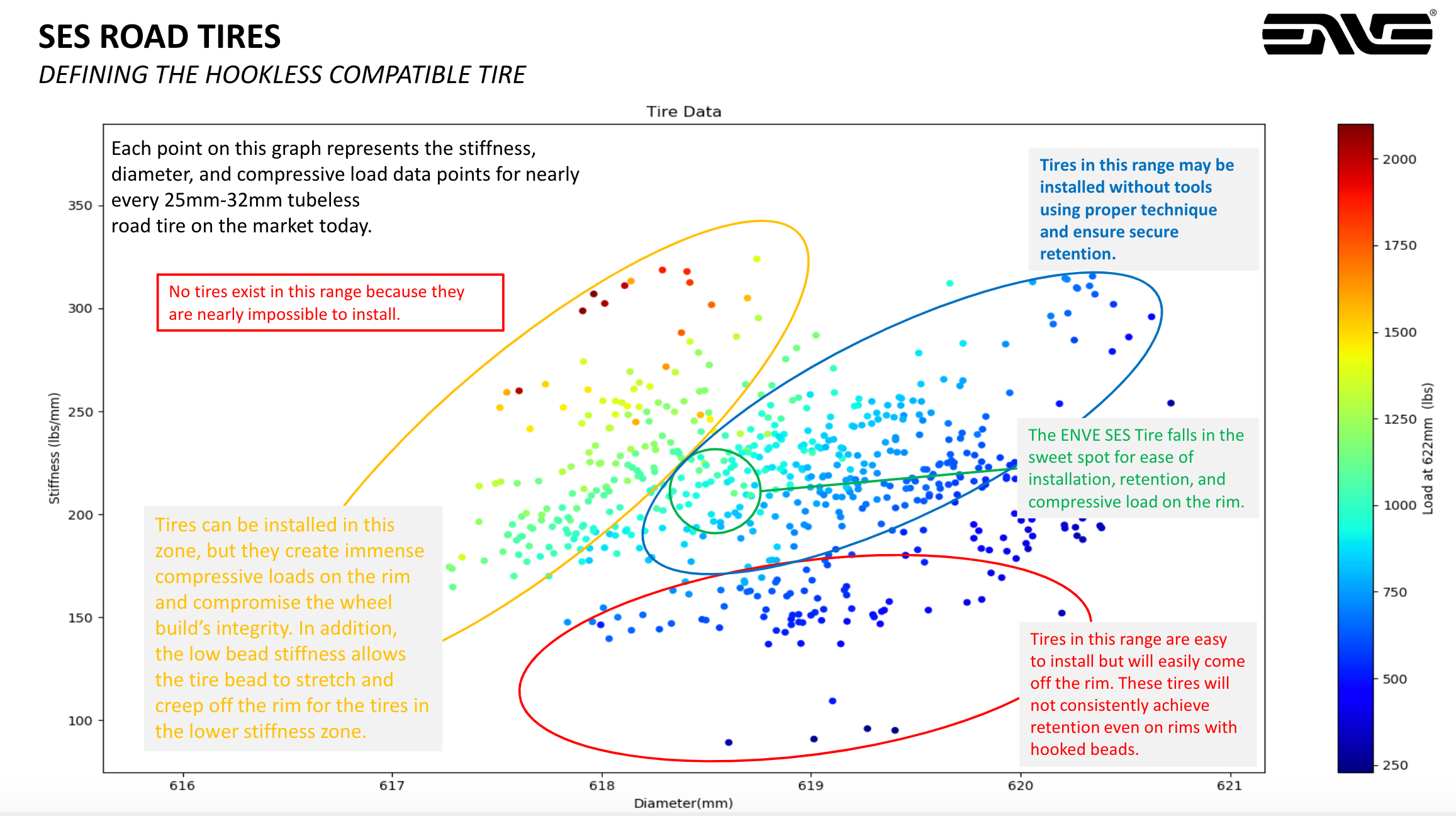 As a manufacturer of tubeless wheels, ENVE is well versed in the variances of tubeless tires on the market in terms of diameter and bead stiffness. The company had done extensive testing (about 300 tires, Child said) and went so far as to create an approved and a non-approved list of tires for its wheels.