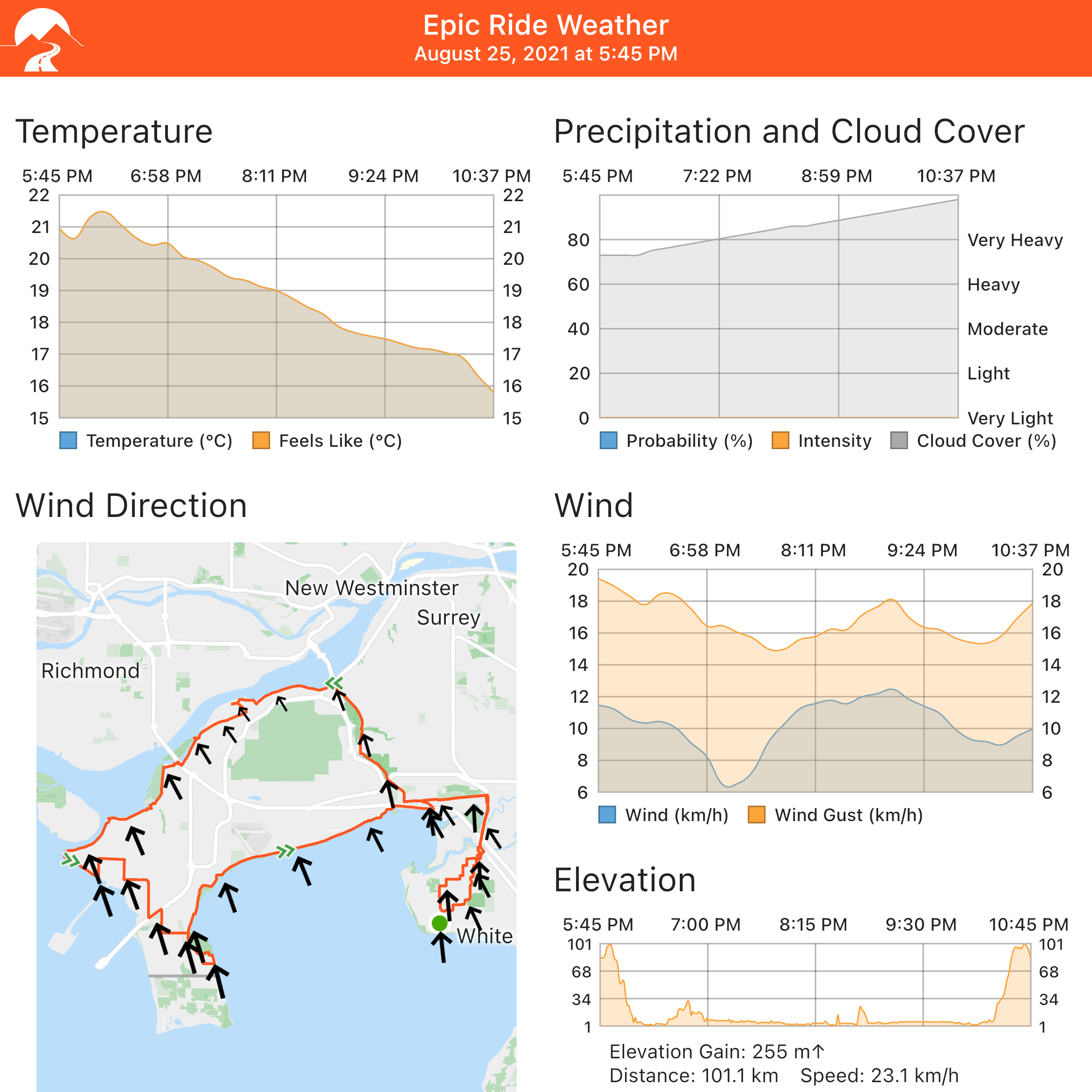Any weather app can give you narrow pieces of this information, showing temperature and wind direction for one given spot, which is almost always a town. But the magic of this app is compilation of all the relevant data points — namely, every place you will be on your ride — with easy-to-digest infographics.