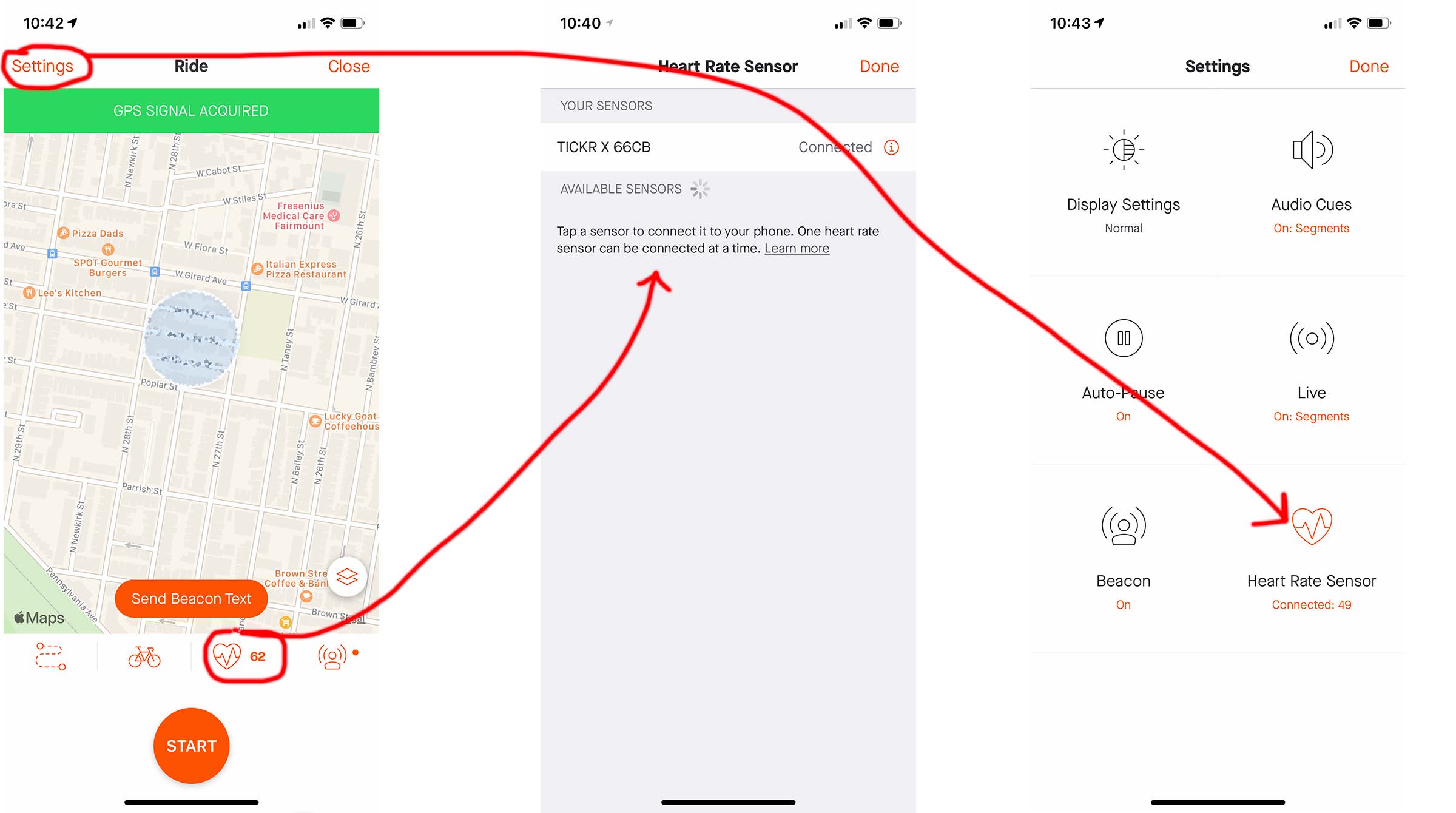 3) Tap the Heart Rate icon above the Start button and select your transmitter OR