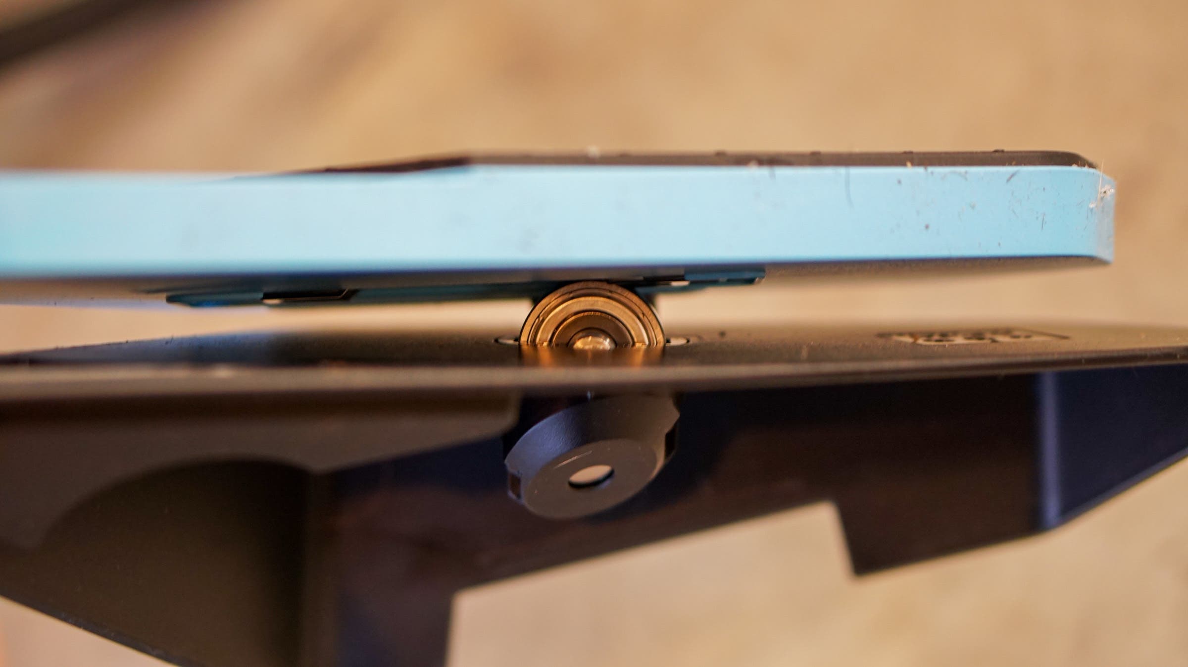 The $299 Neo Motion Plates snap on to the bottom of each leg of the Neo, Neo 2, and Neo 2T trainers. A concave wheel block allows the front wheel to also move slightly forward and backward as the trainer moves fore and aft.
